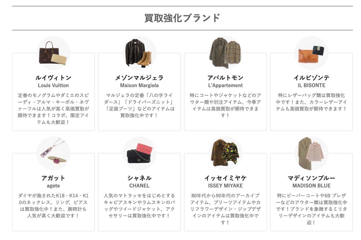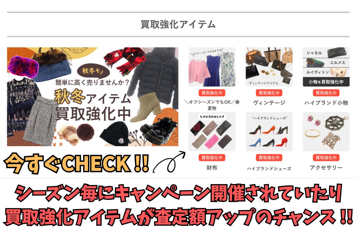 特に、ルイ・ヴィトン、シャネル、エルメス、グッチなどのハイブランドは常に人気が高いため、買取強化の対象となりやすいです。