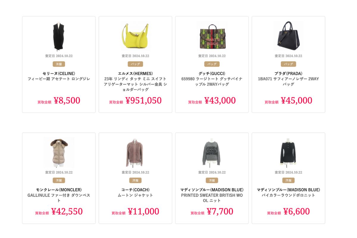 バッグや洋服、シューズ、アクセサリーなど、さまざまなレディースブランド商品を取り扱っており、幅広いアイテムが買取の対象となっています。